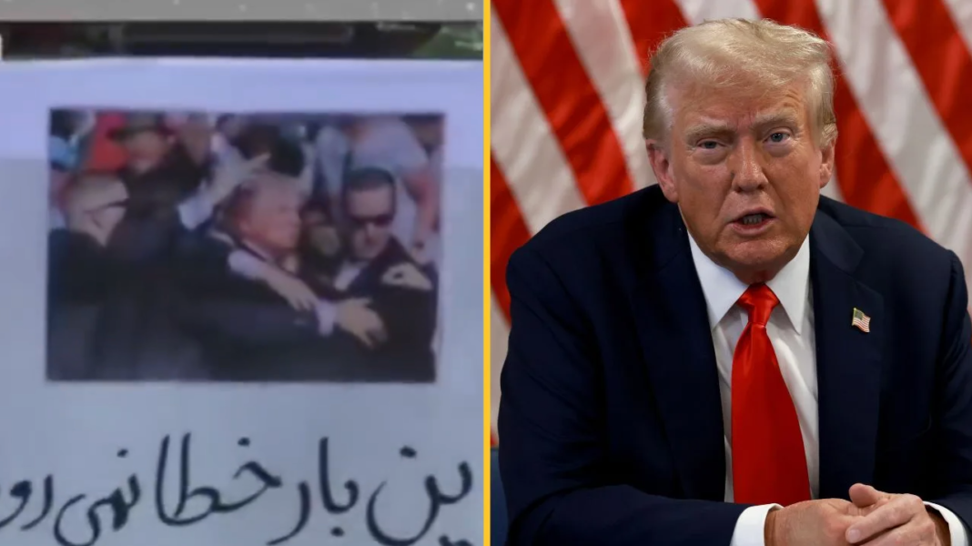 The footage aired by Iranian state media during a funeral ceremony in Tehran on Wednesdayn included an image referencing Trump’s 2024 assassination attempt, was broadcast among banners reading “Death to America”.