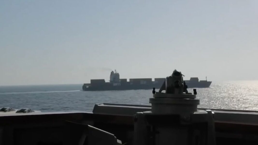 Footage later released by US Central Command appeared to show a naval vessel intercepting a cargo ship, with a gun seen firing in its direction.